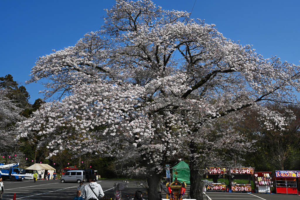 『桜の木の陰影』と『人物・神輿との大きさの比較』で