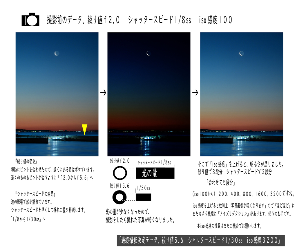 「月も船もキレイに(シャープに)写したいから」🔵絞り値『f2.0』から『f5.6』へ